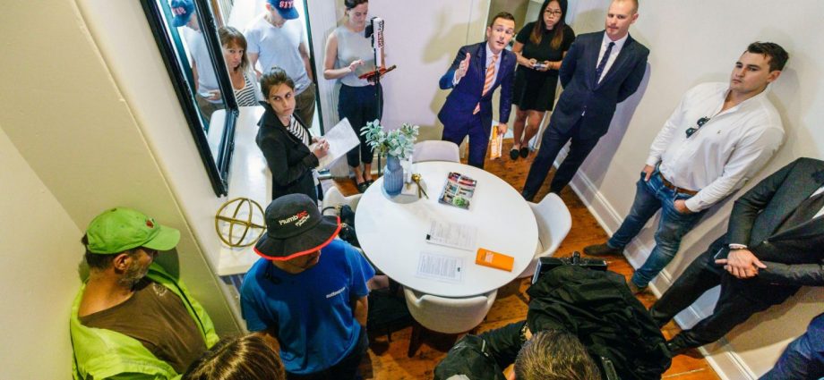 A crowd gathers for the auction of 35 Lansdowne Street, Surry Hills. Photo: Brook Mitchell