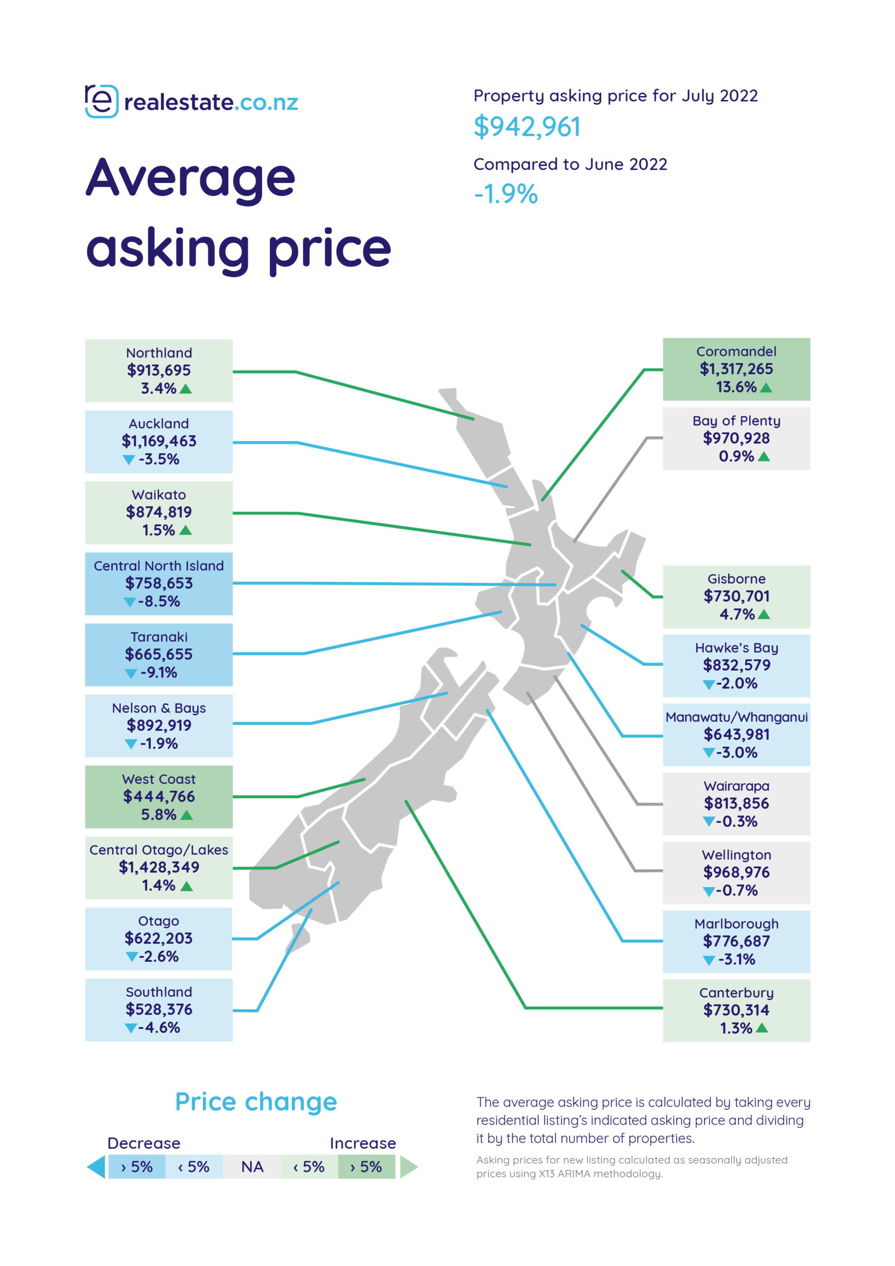 Month-on-month, New Zealand’s regions saw their prices remain relatively stable. The only outlier was the Coromandel, which hit a 15-year record high average asking price of $1,317,265.