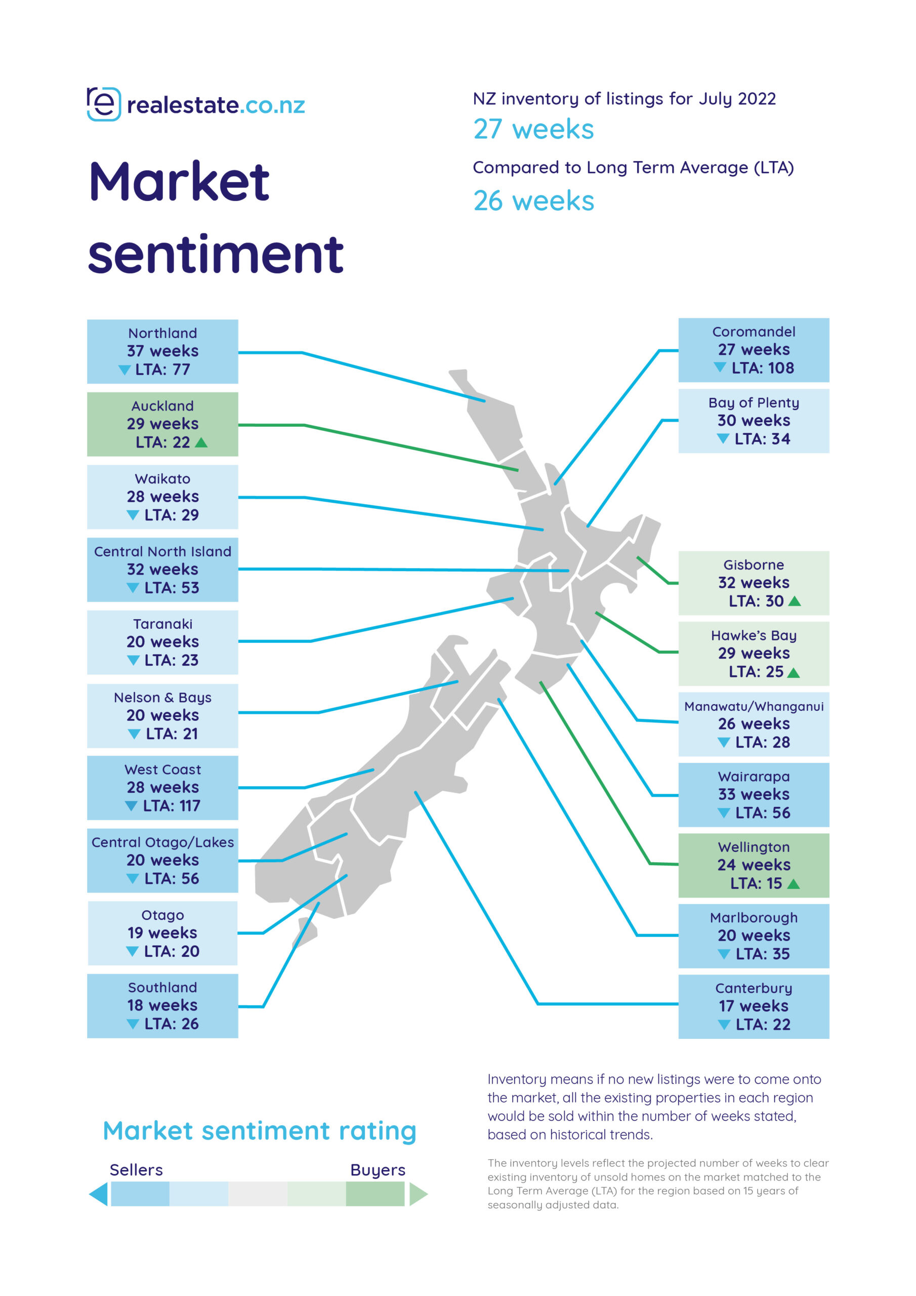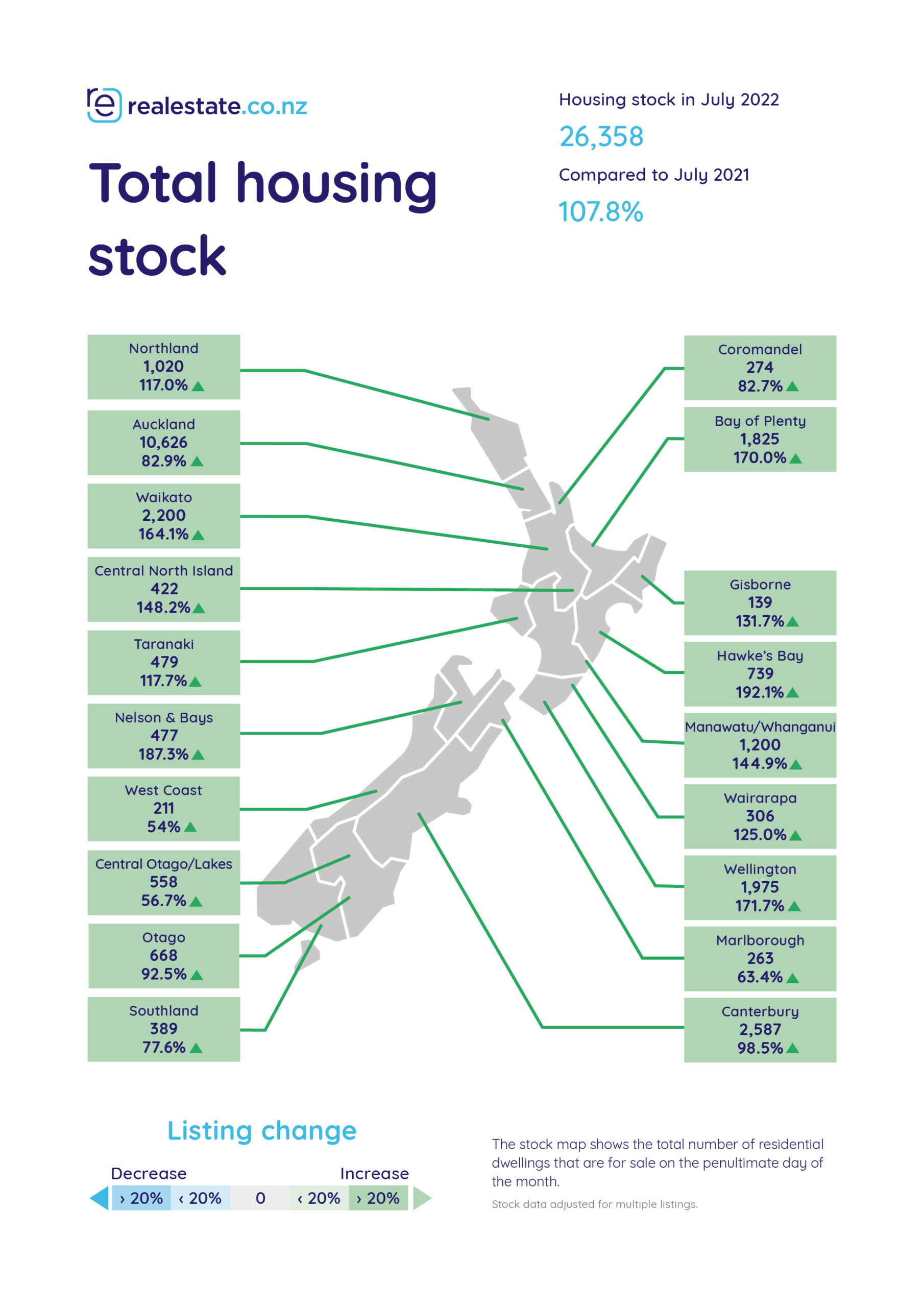 Eleven regions more than doubled their total stock year-on-year in July, including Hawke’s Bay (up 192.1%), Nelson and Bays (up 187.3%), Wellington (up 171.7%), the Bay of Plenty (up 170.0%), Waikato (up 164.1%), Central North Island (up 148.2%), Manawatu/Wanganui (up 144.9%), Wairarapa (up 125.0%) and Northland (up 117.0%)