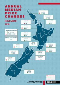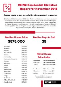 The national median house price in November for residential properties was a record $575,000 up 6.5% from $540,000 at the same time last year. For New Zealand excluding Auckland, the median house price was a record $485,000 up 7.8% from $450,000 in November 2017.