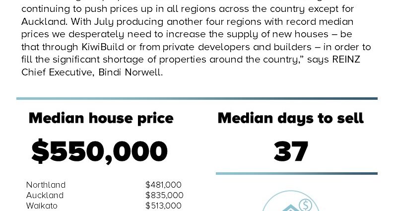 House prices across New Zealand have continued to rise in July with a 6.2% increase year-on-year with a median price for the country of $550,000 according to the latest data from the Real Estate Institute of New Zealand (REINZ), source of the most complete and accurate real estate data in New Zealand.